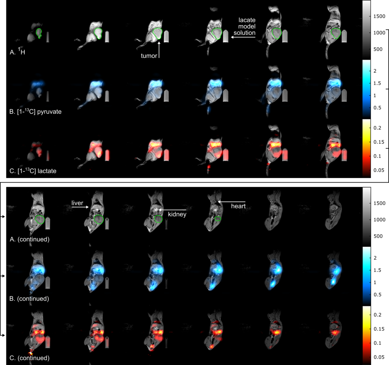 Hyperpolarized [1-13C]pyruvate is most often used in vivo, because of its key role in glucose metabolism, its fast metabolic conversion to lactate, its high achievable polarization level and a relatively long T1. Tumors readily internalize and metabolize pyruvate to lactate by lactate dehydrogenase (LDH-A). The expression of LDH-A is upregulated in many tumors, which results in an increased pyruvate-to-lactate conversion that can be quantified with MRSI.