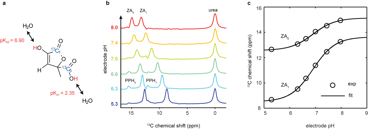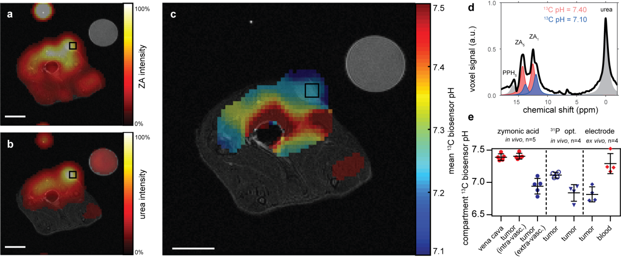 Many efforts have been undertaken to develop an imaging method to characterize hypoxic and acidic regions within tumors, namely a quantitative non-invasive pH imaging technique. However, so far, no technique to non-invasively image extracellular pH has been applicable routinely in the clinic. In humans, pH is mainly regulated by the carbon dioxide/bicarbonate buffer within a narrow pH range, in the blood between pH 7.35 and 7.45. Locally, deviations from the systemic pH are often caused by pathologies, such as cancer, inflammation, infection, ischemia, renal failure or pulmonary disease. Our team identified the pH-sensitive molecule [1,5-13C2]zymonic acid (ZA) which we recently reported in a publication in Nature Communications (Figure 1).